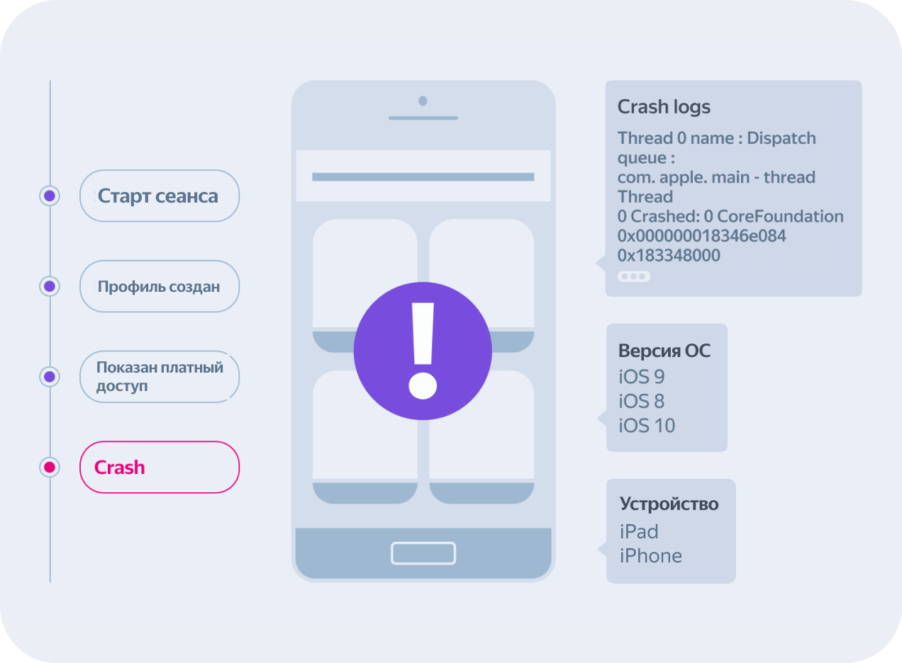 AppMetrica хранит все действия пользователя до появления бага, а также данные о цифровой среде, включая версию приложения, ОС и устройство.