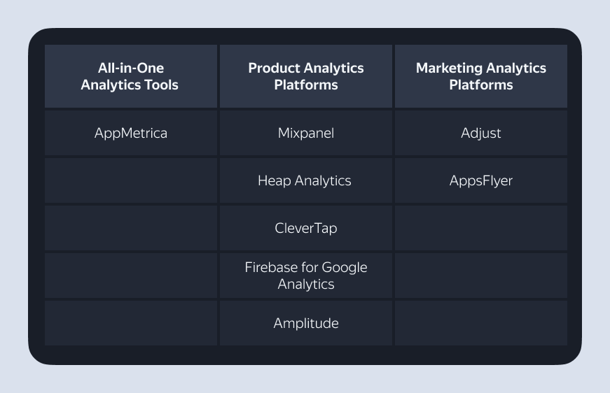 Renowned mobile analytics tools include AppMetrica, Google Analytics for Firebase, Flurry Analytics, Mixpanel, and more. Each tool offers unique features for tracking user behavior, app usage patterns, and performance metrics, catering to the diverse analytical needs and preferences of different app developers and marketers.