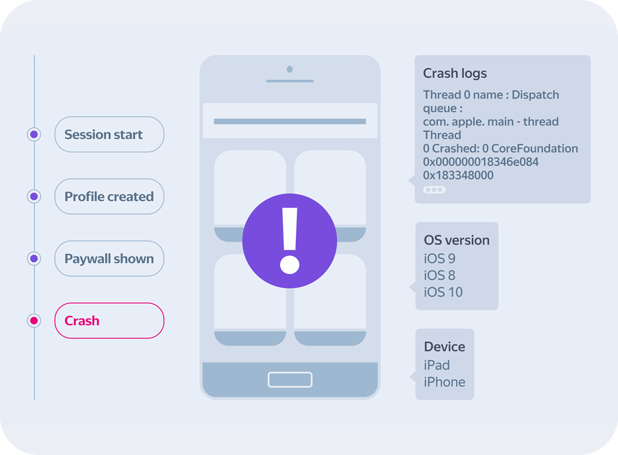 AppMetrica stores all user actions up to the moment the bug occurred. The digital environment, including the application version, OS, and device, is stored too.