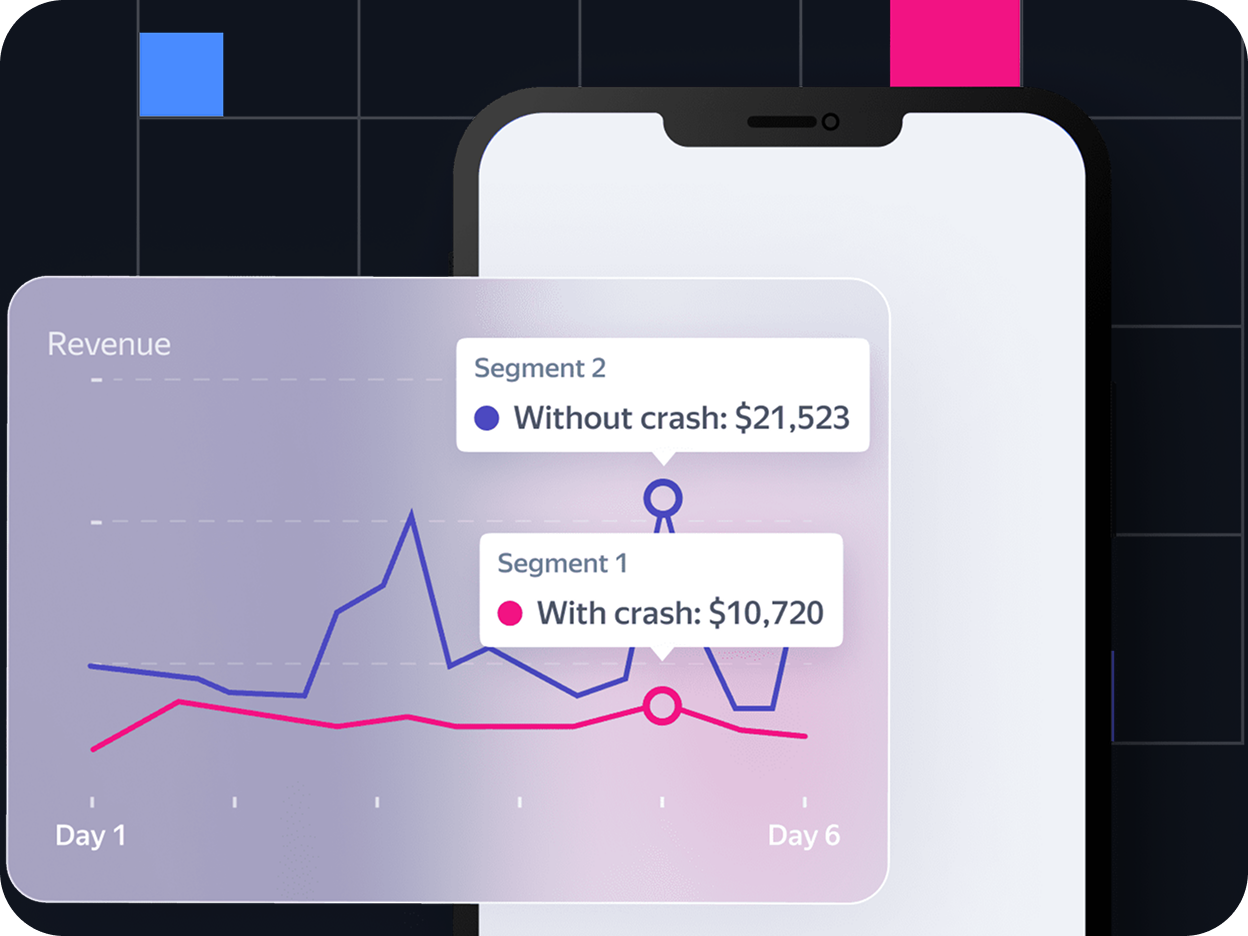Detect and fix crashes and errors before they affect key metrics thanks to alerts and real-time monitoring from AppMetrica.