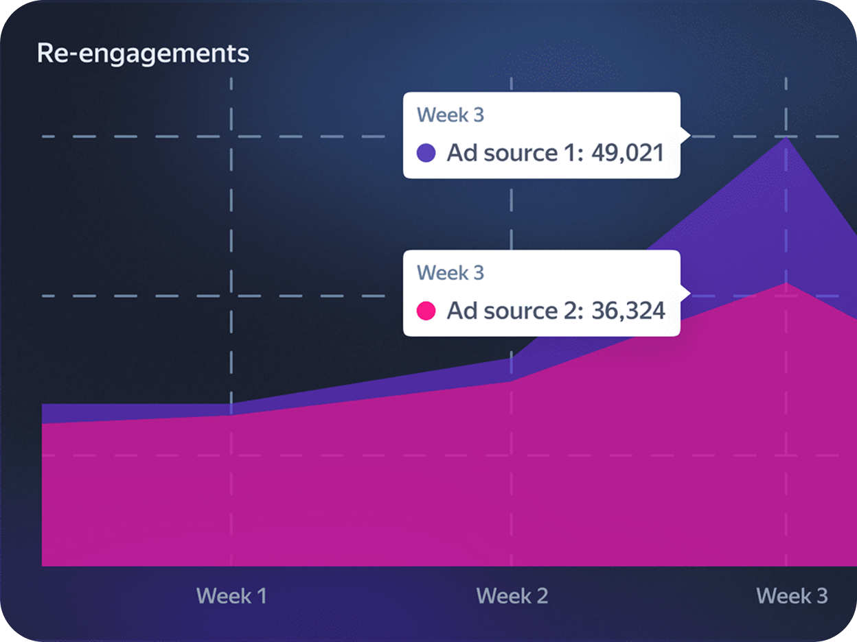 Ramp up growth by measuring ad effectiveness. And picking your best traffic sources with detailed new user behavior reports.