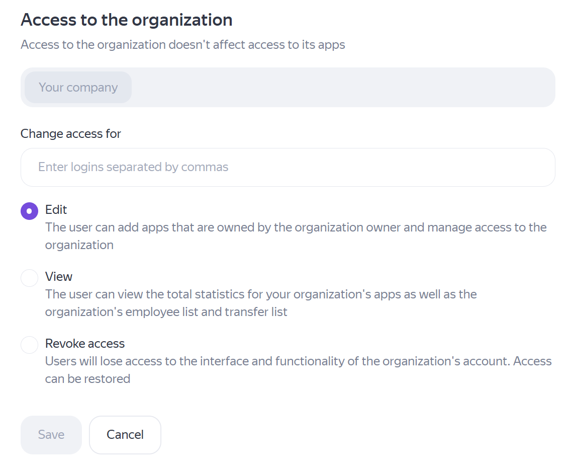 Enter the Yandex email address (login) of the user to grant access to. If this person doesn't have a Yandex account yet, they need to create one.