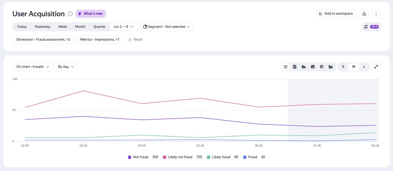 Assessment scores are available in AppMetrica after 3-4 days and may be updated later. You can view them in the Sources → Fraud assessment and Fraud assessment details grouping in the User Acquisition report.