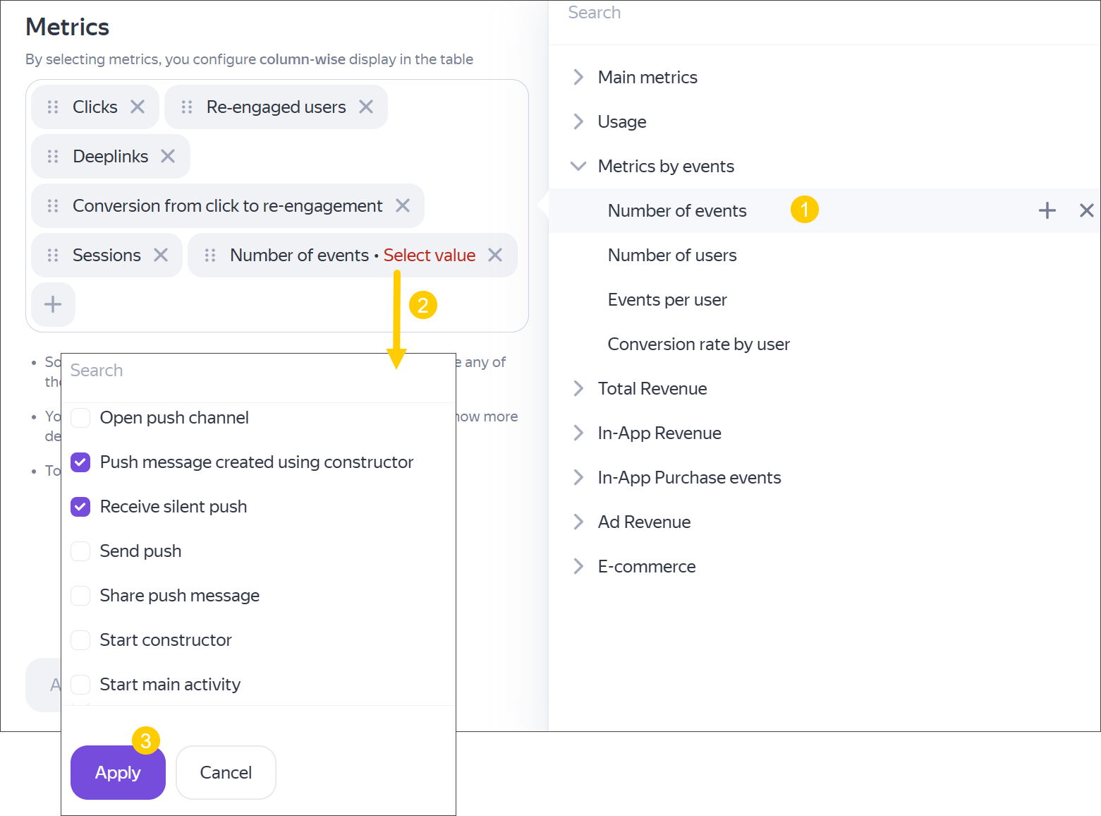 The Metrics by events block counts all events in the selected period that occurred since the re-engagement (reinstallation of the application). The Metrics by conversions block only takes into account attributed actions that are counted according to configured rules. Unlike a regular event, a conversion has an attribution window.