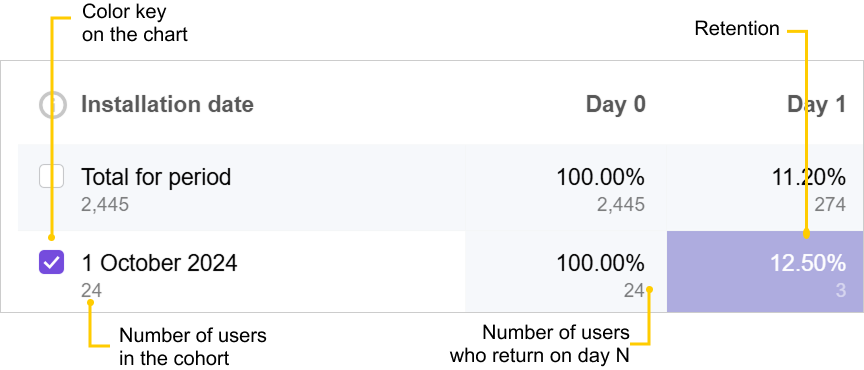 - On the next day after the installation (Day 1, which is outlined with a dotted line), 1 user from the first group and none from the second group returned to the app. The Retention metric is 50% for the first group, and 0% for the second. The installation dates are different, and you can track changes in the Retention metric for the specified period after the installation.