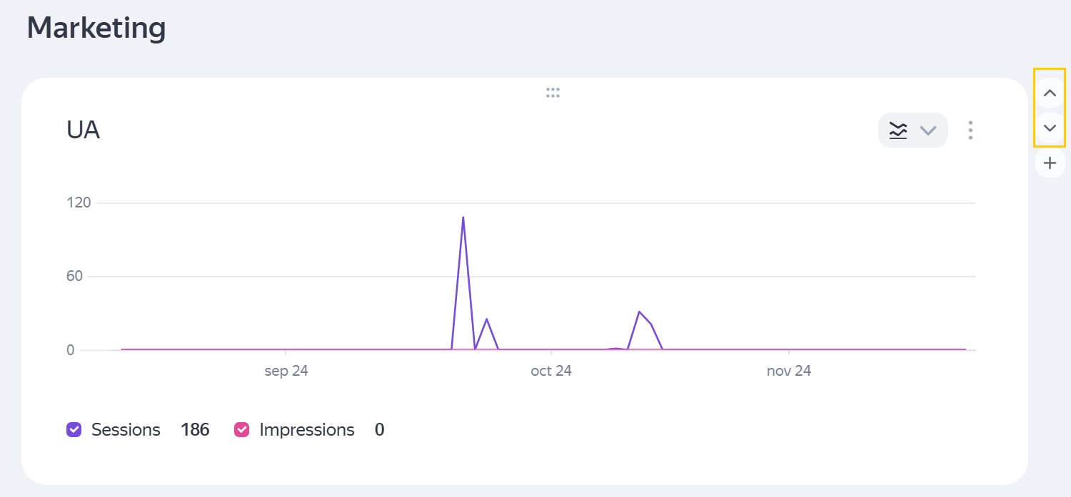 One workspace can have up to 100 widgets. To configure their display on the workspace page, use the Widgets button in the upper-right corner.