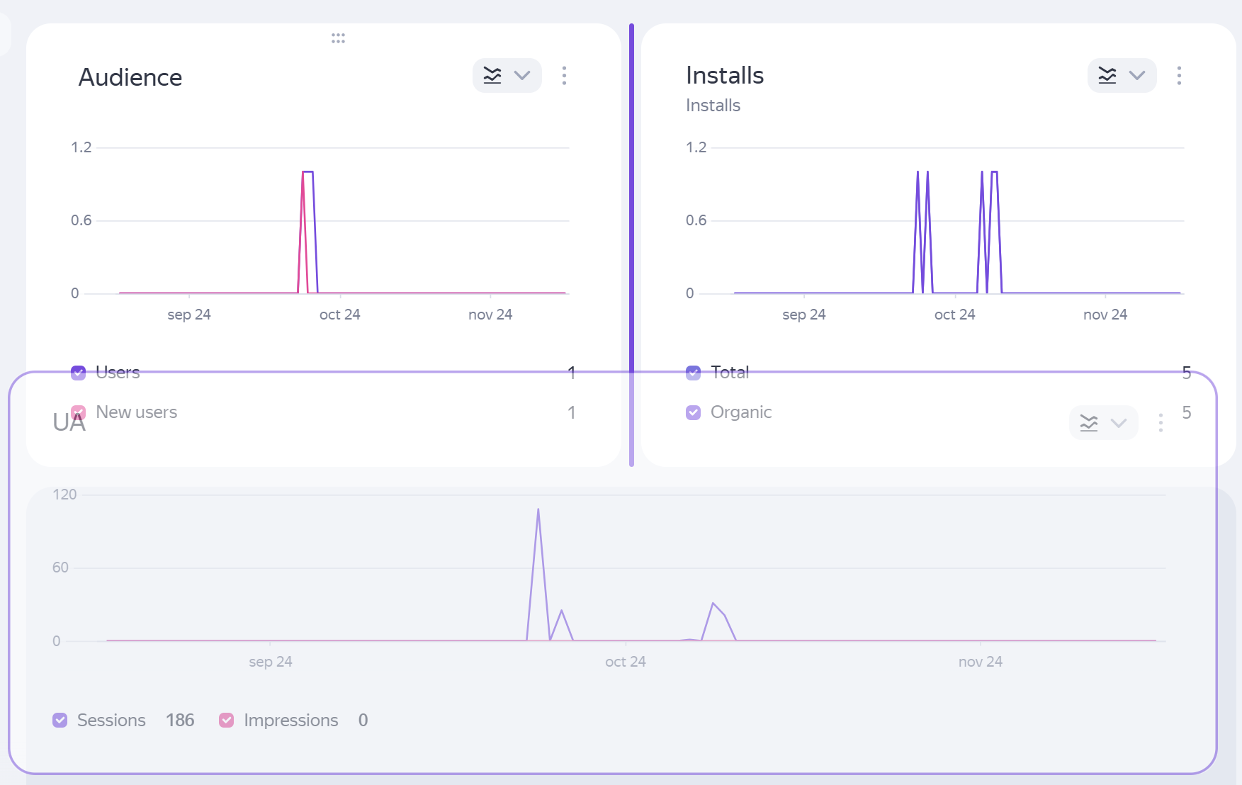 A workspace is a set of widgets with AppMetrica data. By default, AppMetrica provides access to the main Overview workspace. In the Workspaces section, you can create custom workspaces tailored to your app and each team's needs. You can add a variety of widgets to your workspace, reordering them once they're there. Each widget leads to the corresponding report.