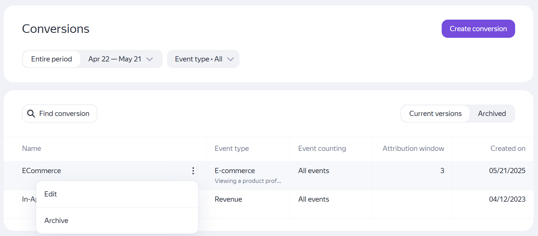 In AppMetrica, you can configure conversion rules for E-Commerce, Ad revenue, Revenue, and custom events. To set up access for events which you'll use to configure conversion rules, navigate to the Manage access section.