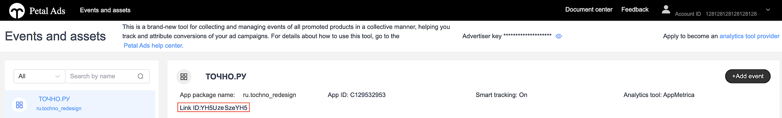To enable tracking, link your AppMetrica and Petal Ads accounts via the Petal Ads Link ID used to attribute the installation source.