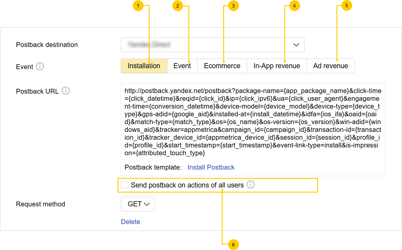 For each type of postback, you can enable postback sending for all users' actions, regardless of whether their installation was attributed to the traffic source or not.