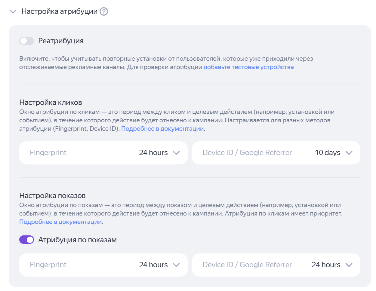 Для тестовых устройств реатрибуция включена всегда (независимо от статуса опции). Подробнее о добавлении тестовых устройств в разделе Тестирование атрибуции.
