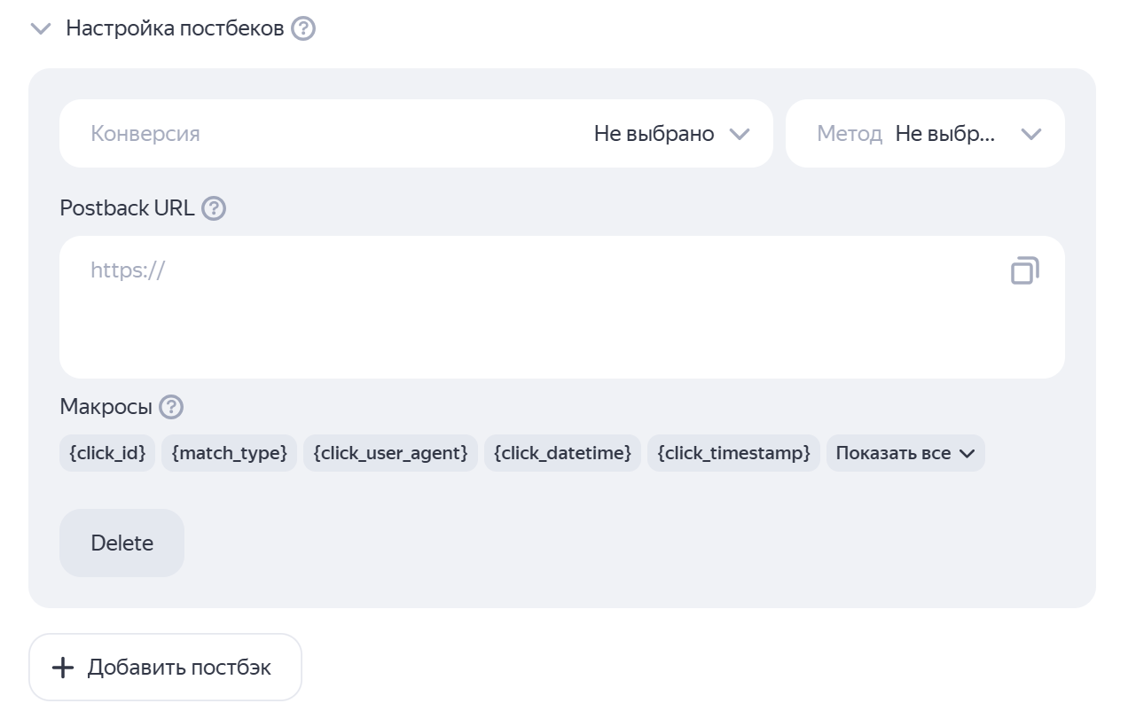 Постбеки используются при проведении CPI/CPA кампаний. Для одного трекера можно добавить до 10 постбеков.