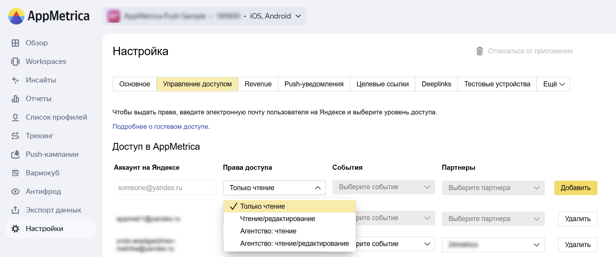 Агентство: чтение — пользователь сможет только просматривать настройки приложения, статистику по выбранным источникам трафика и целевым событиям.